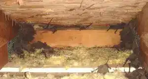 Although bats don’t chew through homes, their waste can cause significant damage over time. Accumulated guano and urine can soak insulation, stain ceilings, and saturate drywall or particleboard—eventually leading to structural deterioration or collapse.